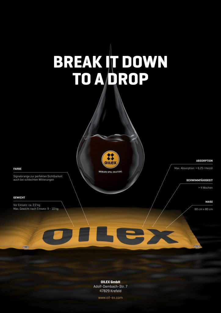 Oilex ist ein universelles Bindemittel, welches insbesondere Öl, Treibstoffe, Chemikalien und Blut, innerhalb von Sekunden aufnimmt. Für die Markteinführung wurde ich von der Agentur „Ausgutemhause“ beauftragt, Key-Visuals für diese Anwendungsbereiche zu entwickeln und umzusetzen.